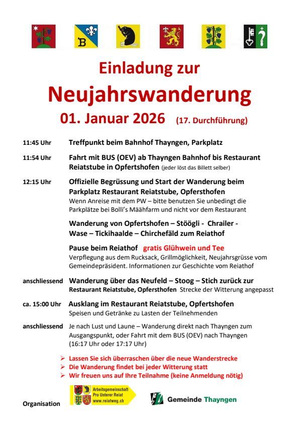 Die Wanderung führt über die Reiathöhe zum bekannten Reiathof, wo die Möglichkeit zum Grillieren besteht. Für Wärme und gute Stimmung sorgen Glühwein und Tee, während spannende Geschichten rund um den Reiathof erzählt werden und der Gemeindepräsident seine Neujahrsgrüsse überbringt.